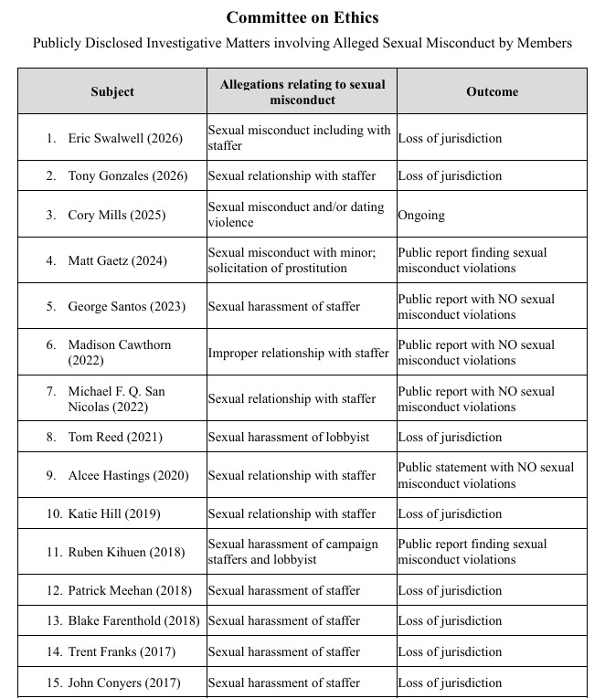 Publicly Disclosed Investigative Matters involving Alleged Sexual Misconduct by Members, House Committee on Ethics, April 2026.