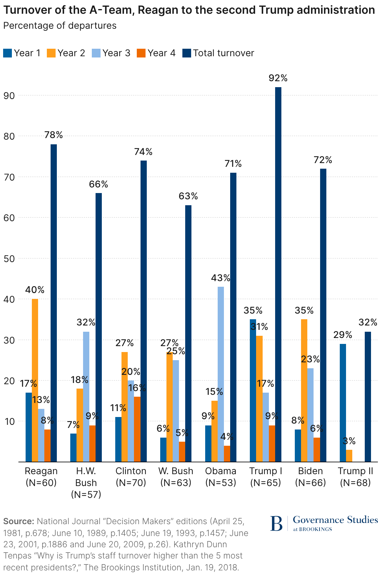 Tracking turnover in the second Trump administration, Brookings, January 20, 2026, updated through April 15, 2026.