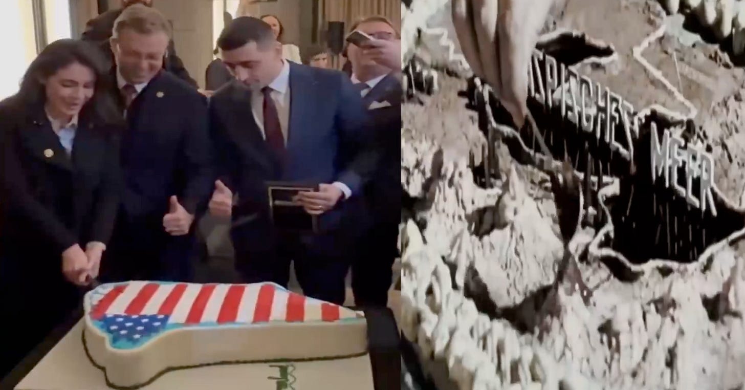 The contemporary footage is authentic. Video shows Republican lawmakers and guests in Washington, D.C., cutting a cake shaped like Greenland and decorated with the American flag during an event at …
