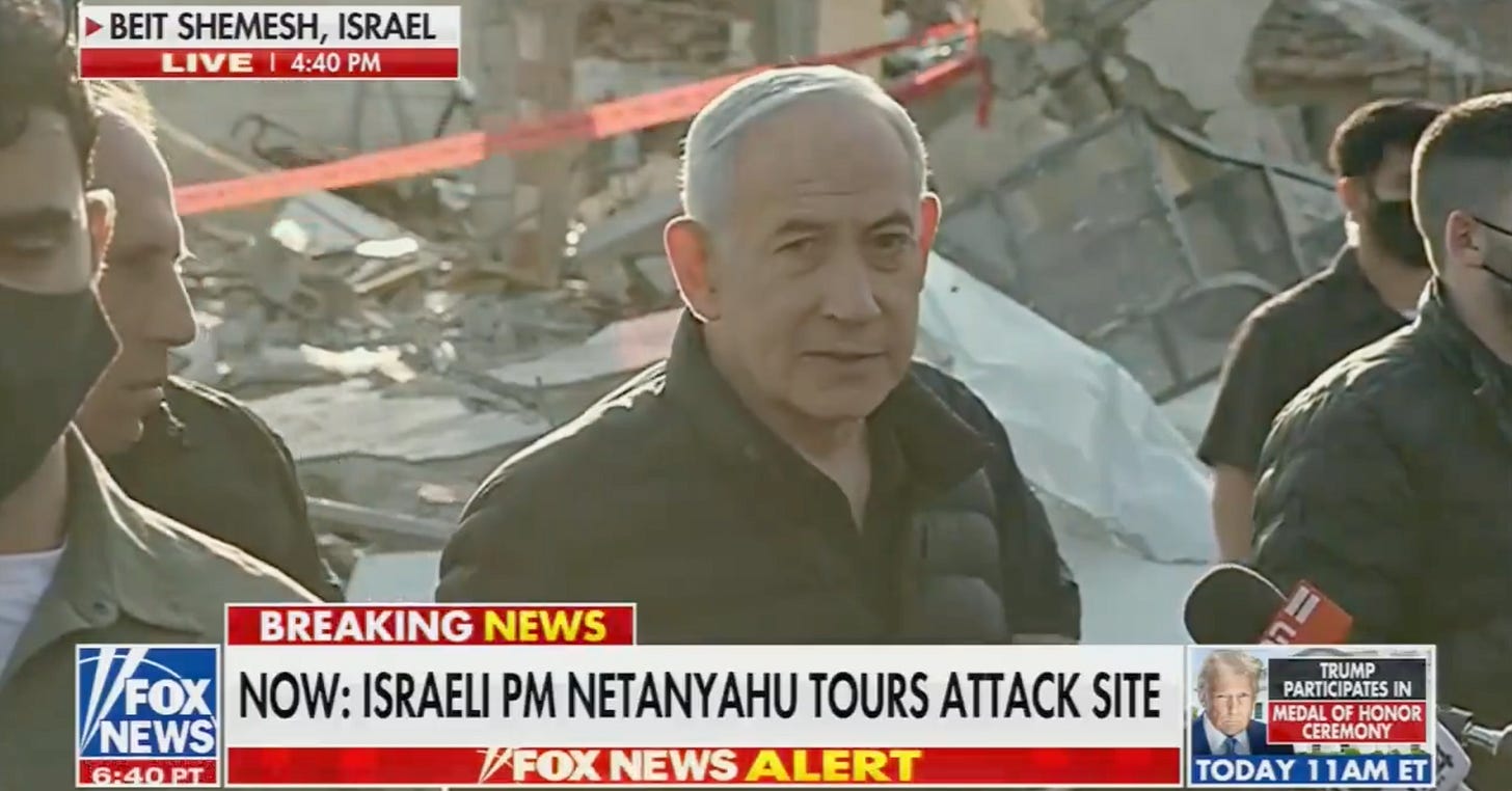 Israeli Prime Minister Benjamin Netanyahu publicly thanked former President Donald Trump while touring an attack site in Beit Shemesh, Israel, framing the moment as part of a broader effort tied to escalating strikes involving Iran.