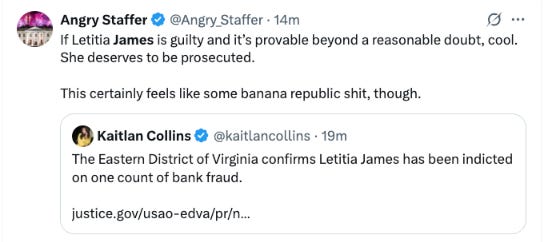 And the few who dare to speak — like Letitia James — are now being dragged through the mud, one indictment at a time.