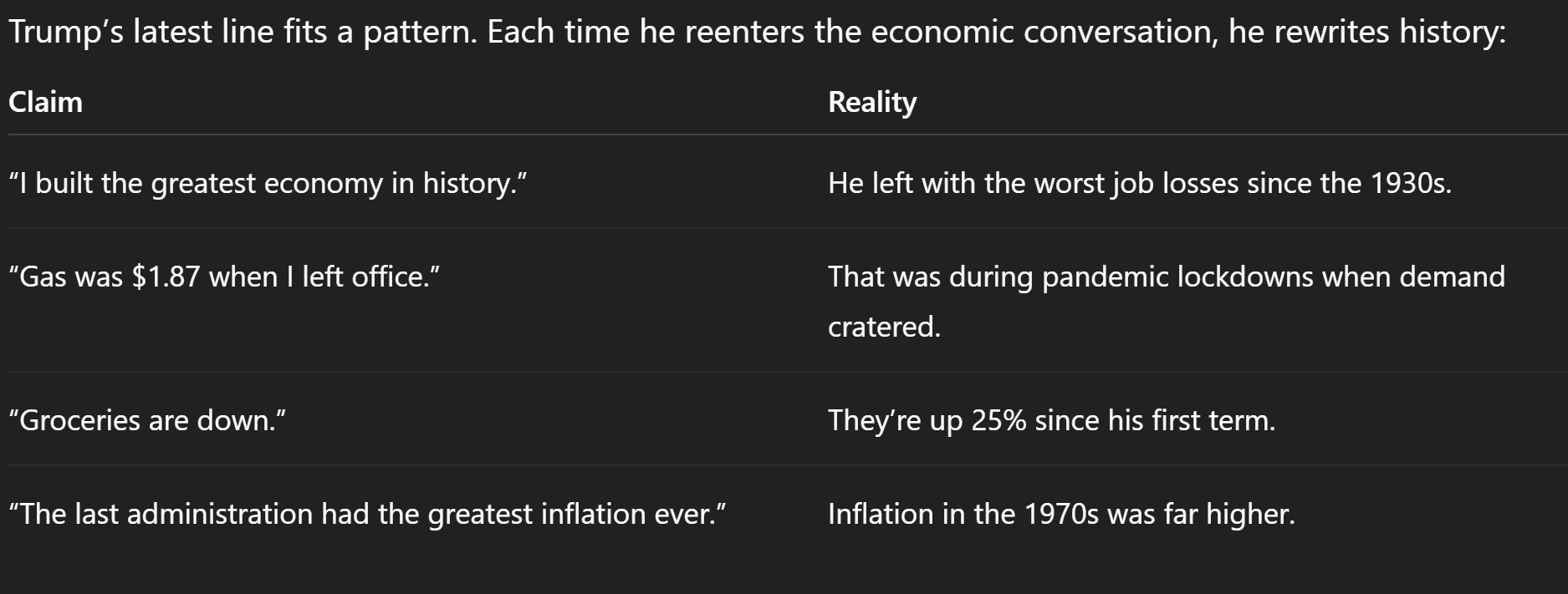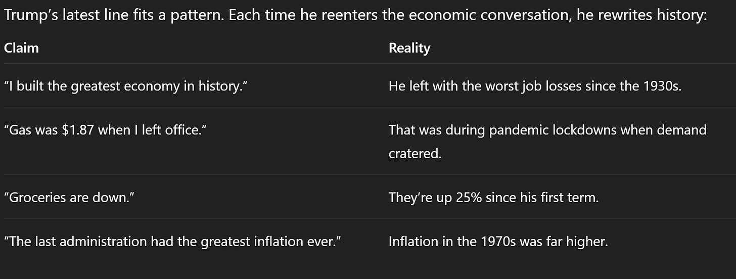 In other words: prices are not down, inflation is not “the greatest,” and Trump’s economic record isn’t the miracle he keeps selling.