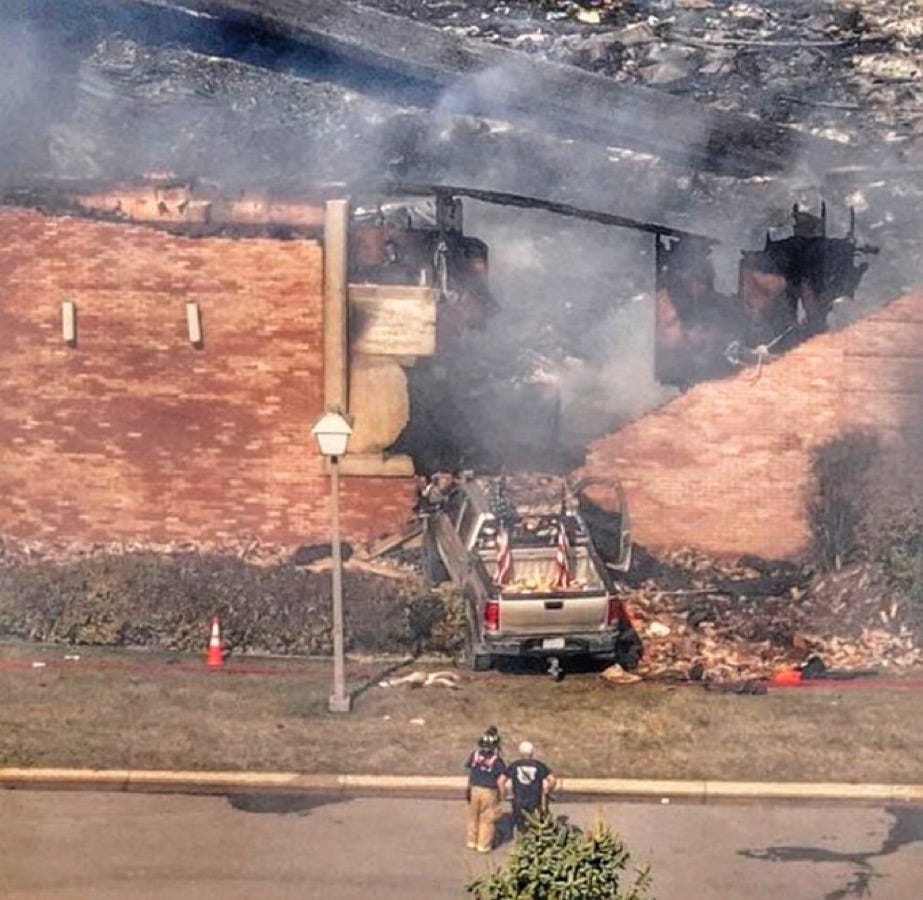 He exits the vehicle, opens fire, then reportedly uses gasoline (and possibly explosives) to set the structure ablaze.