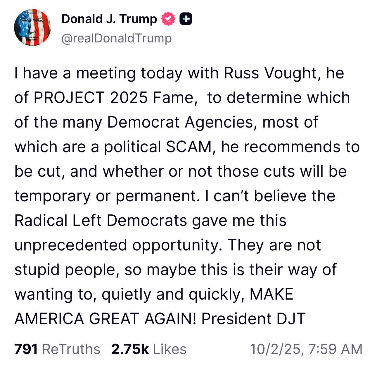 Donald Trump just said the quiet part out loud. On Truth Social this morning, he bragged about meeting with Russ Vought — the chief architect of Project 2025 — to decide which federal “Democrat agencies” should be cut, either temporarily or permanently.