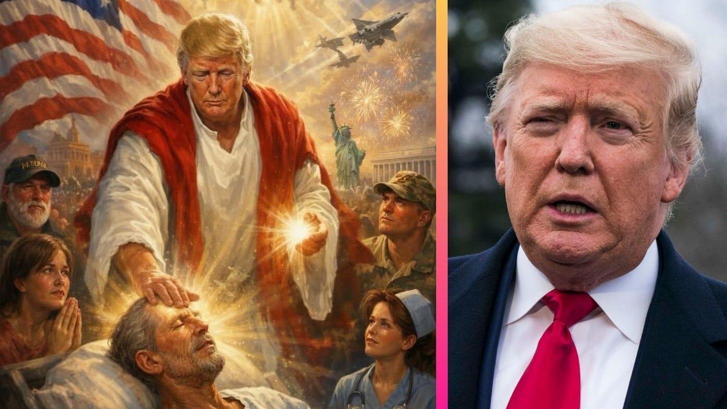 According to reporting from outlets including People and The Guardian, the image showed Trump in red-and-white robes appearing to heal a man with glowing light, surrounded by American flags and other patriotic symbols.